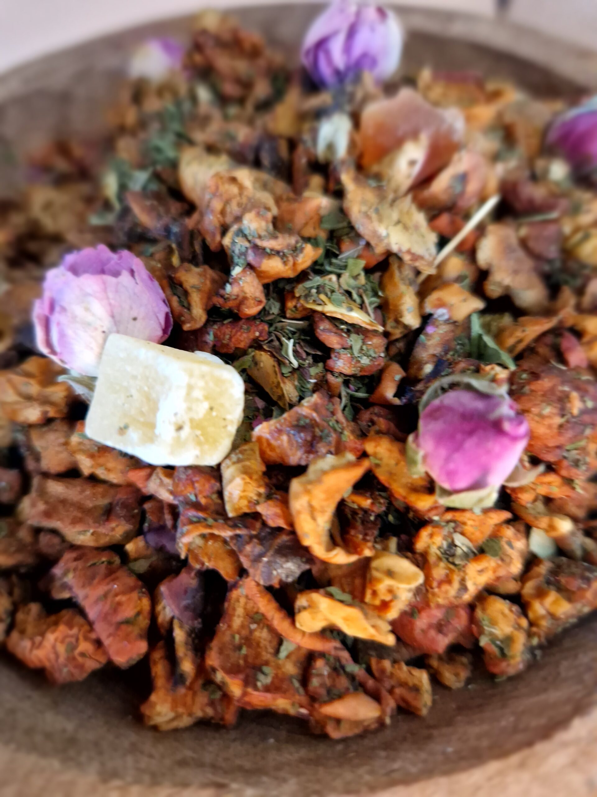 Morceaux de pomme, morceaux de papaye, boutons de roses, menthe, arômes.