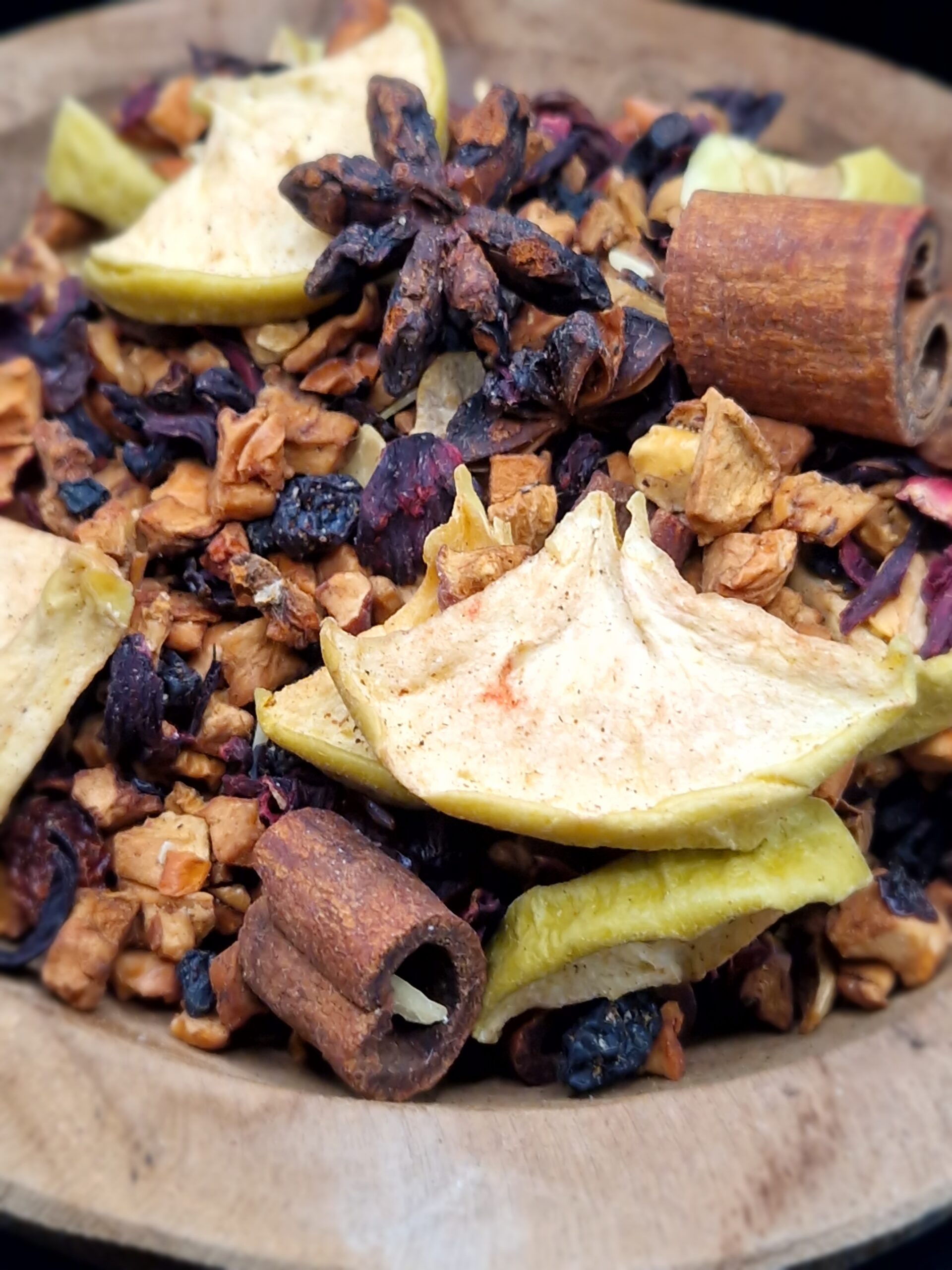Composition : morceaux de pomme, hibiscus, rouleau de cannelle, cynorrhodon, amande, baies de sureau, badiane, arôme naturel.