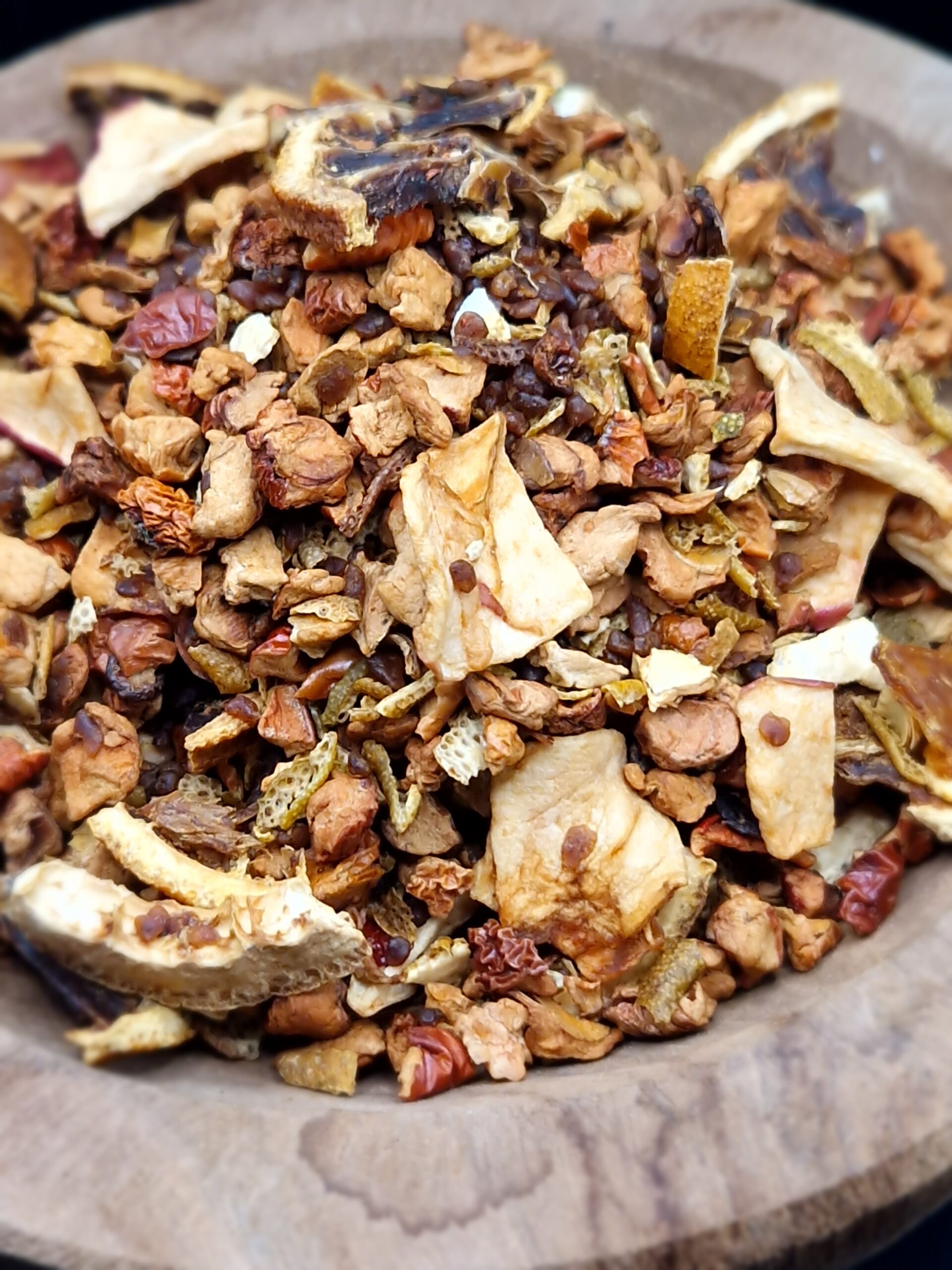 Composition : morceaux de pomme, morceaux d’abricot, écorces d’orange douce, tranches d’orange, tranches de pomme, arômes naturels.